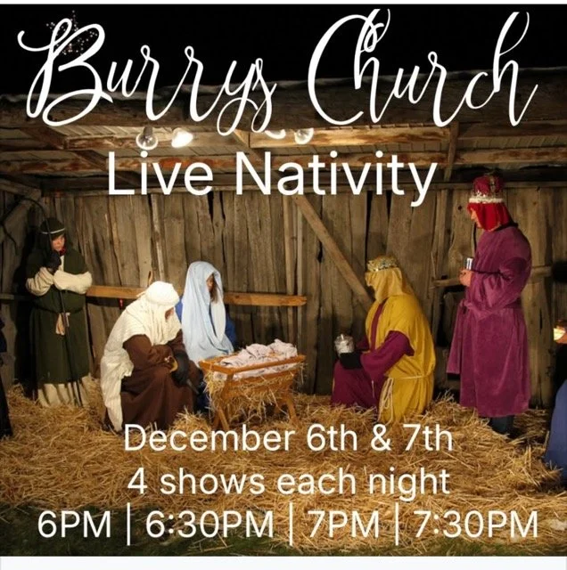Please come and witness a living recreation of the story of Christ’s birth in Burry’s Church’s presentation of the “Live Nativity.” Your whole family will enjoy it as you watch from the comfort of your car, while volunteer actors perform in a living nativity scene complete with a rustic manger, a humble stable, and live animals.